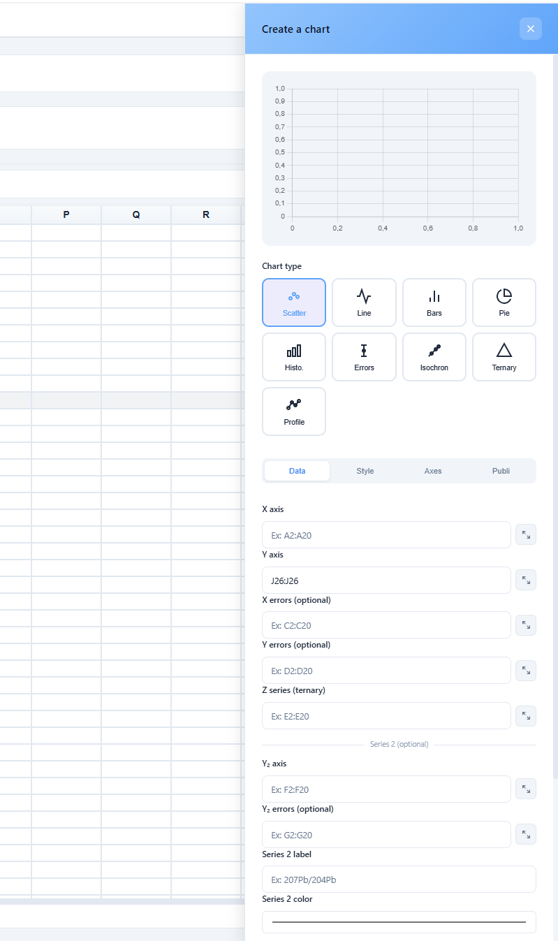 If a range is selected when the panel is opened, the X and Y data ranges are pre-filled automatically. The panel provides a real-time preview updated on every modification. When creating an error bars chart, IsoFind automatically detects uncertainty columns if they are named with the suffix (2σ).